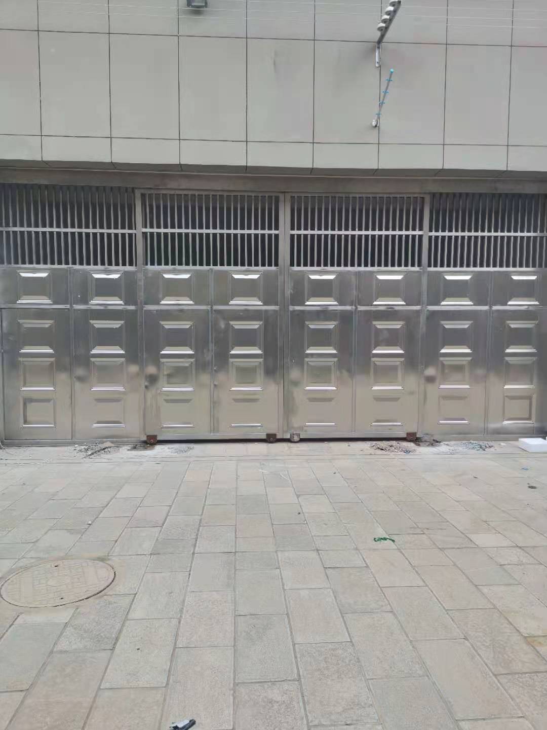 門扇厚度為100 mm,大門所用材料為SUS304不銹鋼。外框采用100×100×3mm方管,內(nèi)骨架尺寸800×800mm,采用,100×50×2mm方管,雙面封1.5mm厚不銹鋼磨沙板,中間聚氨酯發(fā)泡,外框內(nèi)框和封板均采用焊接和柳接工作工藝制作,表面打磨光滑,下軌道采用12kg鋼軌道,上導(dǎo)道采用120#防傾倒槽鋼,導(dǎo)向輪采用¢100軸承。整個(gè)門體采用下承重方式,齒輪齒條傳動(dòng)。門體上端1.4米處采用相同材料進(jìn)行封閉。門安好后門體抗沖擊強(qiáng)度可抵御風(fēng)速大于117kn/h的颶風(fēng)。
